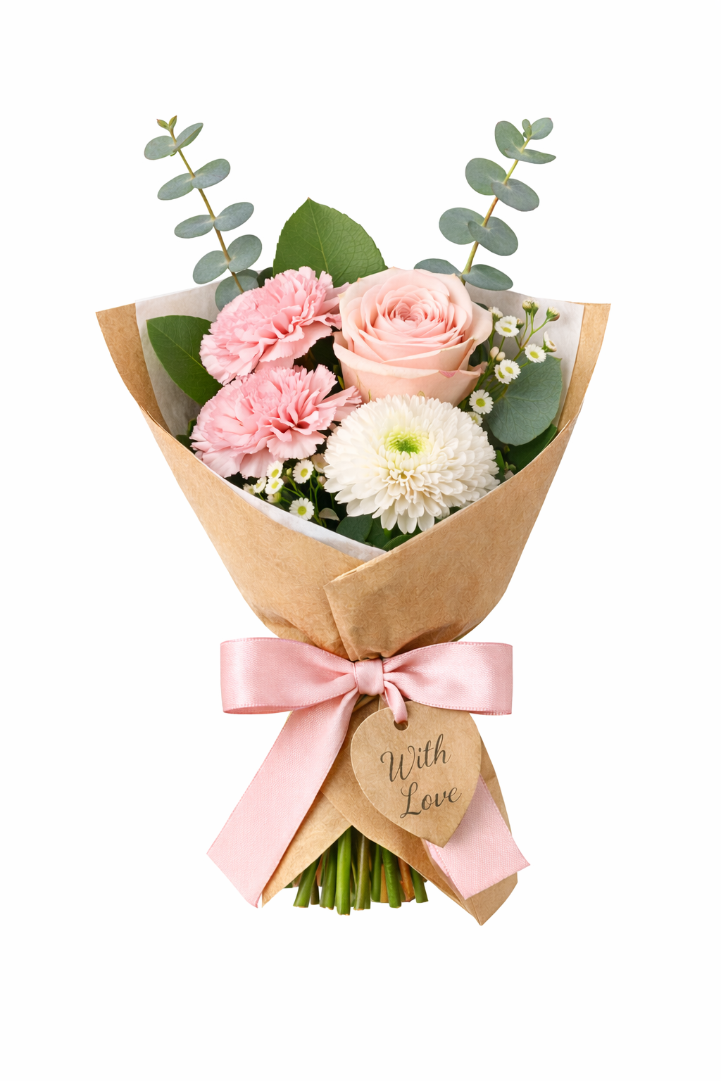 Sweet, simple, and full of charm — our Mini Love Note Bouquet is the perfect little Valentine gesture. Designed in soft blush tones with premium blooms and fresh greenery, this petite hand-tied bouquet is wrapped in natural kraft paper and finished with a pink ribbon for a beautiful gift-ready touch.