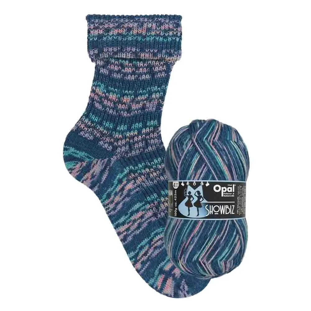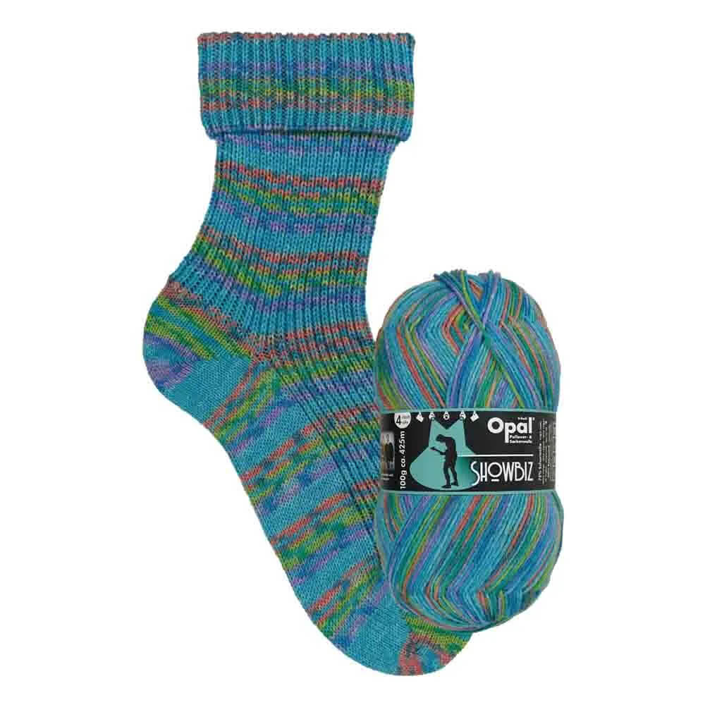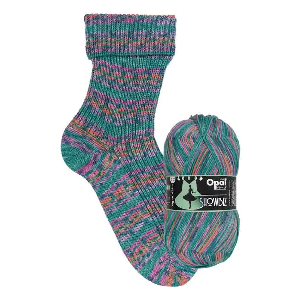 Opal Showbiz 4-ply is a durable sock yarn made from 75% superwash virgin wool and 25% polyamide. The collection features colourful self-striping patterns inspired by the performing arts. Ideal for knitting warm socks, and also great for sweaters, hats, mittens, and scarves.